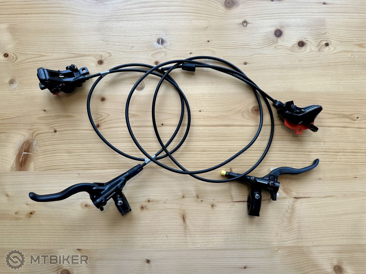 Páky a strmene spájajú hadice SM-BH90-SS vpredu dlhá 90cm a vzadu 175 cm. Predná brzda je pripravená na požitie, zadnú traba spojiť páku s hadičkou a odvzdušniť - nutné dokúpiť tŕň a olivu. Strmene obsahujú doštičky D03S Resin.