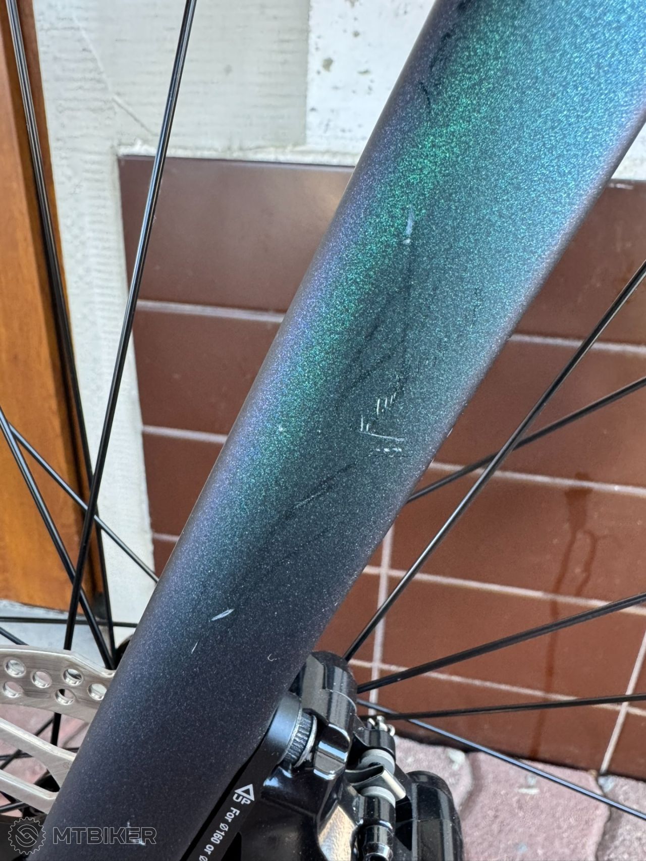 Na ľavej karbónovej vidlici je malinký škrabanec, ktorý vznikol pri prevoze bicykla autom (viď foto).